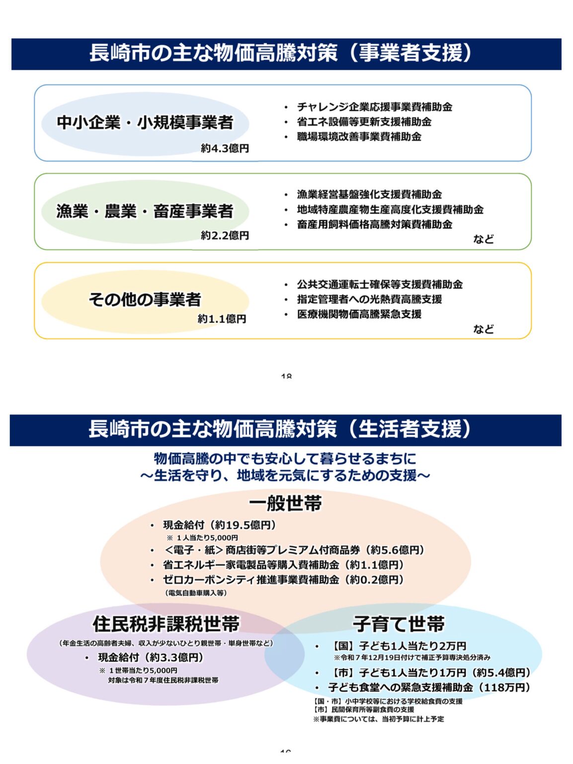 事業者支援としては、だいたいこれまでの支援メニューと同様となっていて、チャレンジ応援支援金、水産や農業、畜産への燃料、肥料、飼料などの物価高騰に対する支援、路線バスや路面電車のバリアフリー推進のための補助などとなっています。